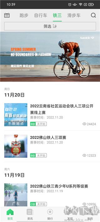 3、進入軟件首頁可以看見跑步、自行車、鐵三、滑步車、資訊、騎行、發(fā)現(xiàn)、我的選項。