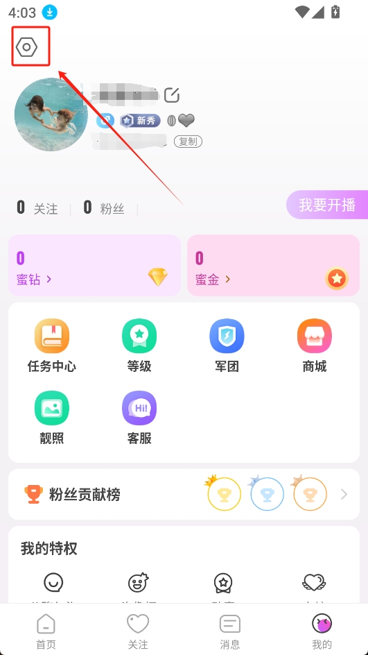 1.打開蜜瘋直播app,進(jìn)入主頁后點(diǎn)擊右下角“我的”。如圖所示: