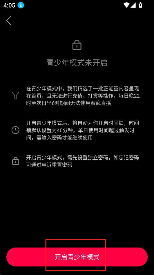 4.點(diǎn)擊最下方的“開啟青少年模式”即可。