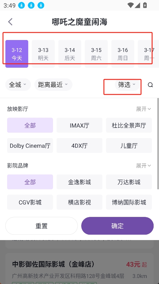 3.選好觀影時間,選擇好篩選條件后點擊確定;