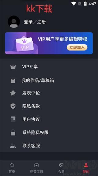 1、從kk下載站下載視頻剪輯APP,首先需注冊(cè)賬號(hào)并完成登錄,方可使用;