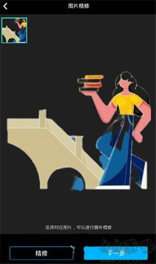 3、查看摳圖效果。若對(duì)摳圖效果不滿意,可點(diǎn)擊精修以去除邊緣圖案;若對(duì)摳圖效果滿意,直接點(diǎn)擊【下一步】進(jìn)入編輯頁(yè)面。