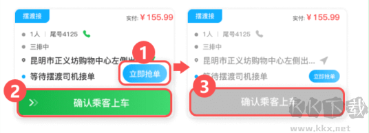 操作步驟:通過滑動(dòng)操作,依次執(zhí)行①「確認(rèn)乘客上車」;②“乘客已上車” 按鈕置灰(不可操作)。