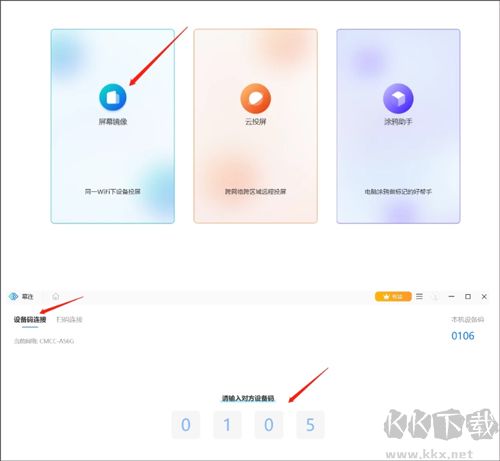 3、電腦端幕享點(diǎn)擊【屏幕鏡像】——【設(shè)備碼連接】。將剛剛 手機(jī)端【我的投屏碼】輸入在下方方框內(nèi),手機(jī)就成功投屏在電腦上了