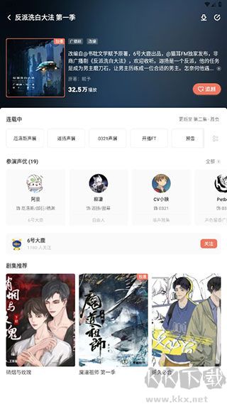 2、廣播劇區(qū)包含推薦、用戶作品、連載中、單期劇集等多個(gè)分類;