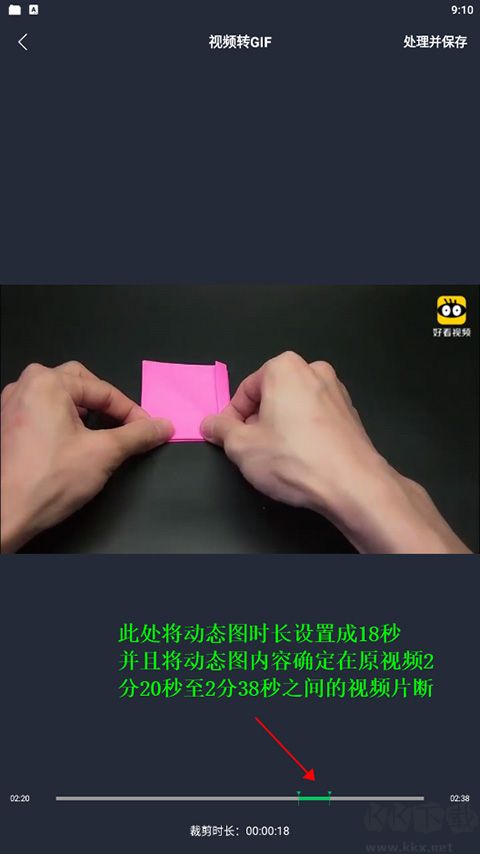 3、在打開的新頁面底部的進(jìn)度條中,用戶可以左右兩側(cè)移動進(jìn)度指針來設(shè)置動態(tài)圖的時間以及其圖片內(nèi)容,之后單擊右上角【處理并保存】
