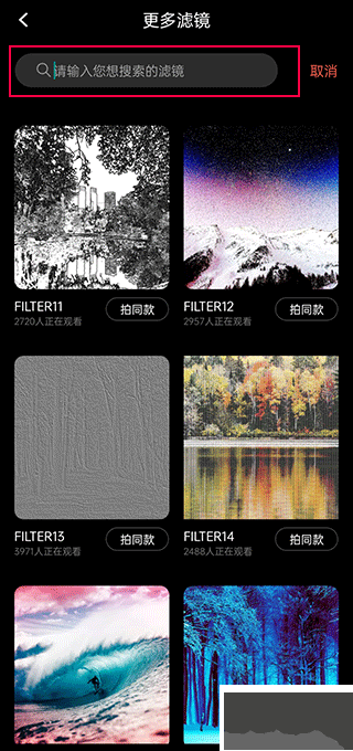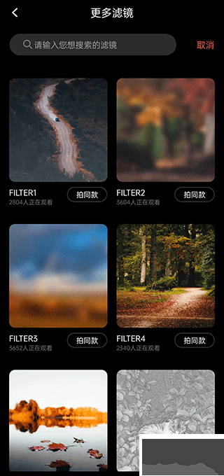 3、若在眾多濾鏡中難以快速找到心儀款式,也可以通過自行搜索的方式查找,找到合適的濾鏡后,點擊 “拍同款” 選項,就能立即使用該濾鏡進行拍攝或修圖。