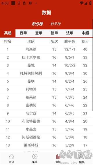 3、數(shù)據(jù)頁面提供各球隊(duì)基本數(shù)據(jù)及積分榜信息