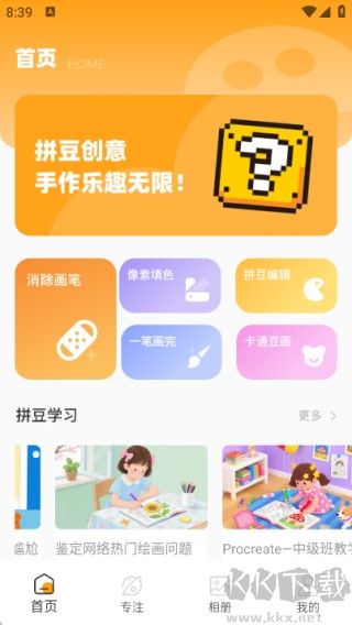 3、在專注頁面中,程序為用戶提供專注拼豆、豆畫清單、豆畫繪本及打卡豆畫、基礎(chǔ)豆畫等不同板塊;