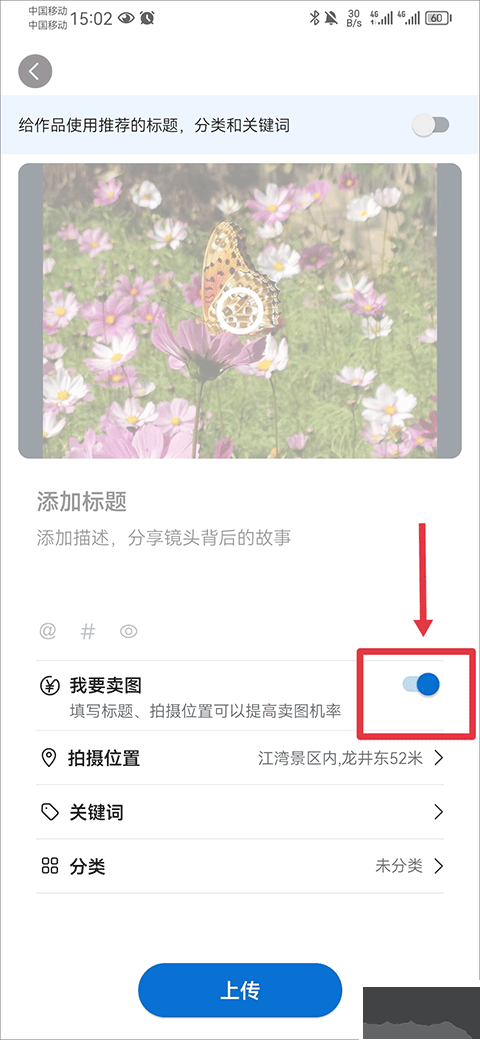4、最后在作品上傳界面,把作品標(biāo)題、描述、分類(lèi)等補(bǔ)充完整,再開(kāi)啟我要賣(mài)圖功能。