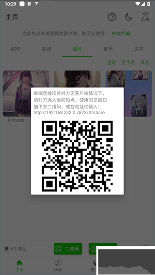 選擇完成后,如果是單端連接,只有一端有面對(duì)面快傳軟件,可以讓對(duì)方掃描二維碼,或者瀏覽器內(nèi)輸入鏈接,就能瀏覽網(wǎng)頁(yè)版的面對(duì)面快傳進(jìn)行傳輸;