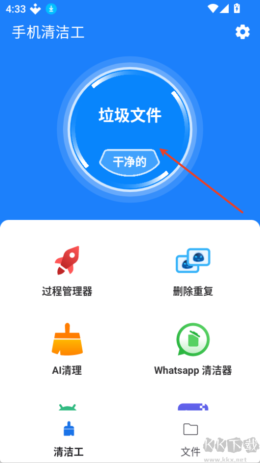 2、進(jìn)入主界面后,可看到進(jìn)程管理、重復(fù)文件清理、AI清理、WhatsApp清理等多種功能,點(diǎn)擊頂部圖標(biāo)繼續(xù);