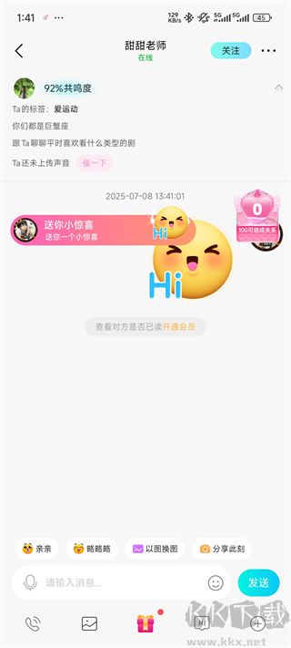 5、匹配成功后會進(jìn)入聊天界面,這時候你可以根據(jù)她的愛好進(jìn)行交流慢慢處成對象