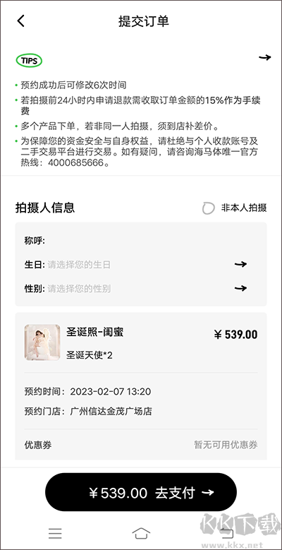 5、在【提交訂單】頁面,核對拍攝人信息,確認沒有問題后,點擊【去支付】就能完成拍照預(yù)約。