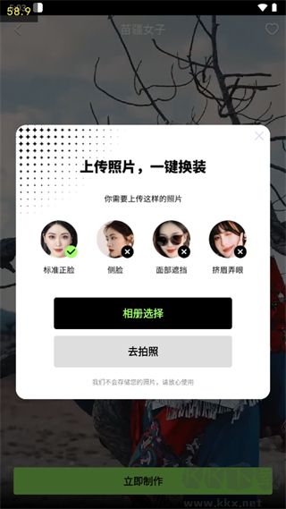 4、點(diǎn)擊立即制作,拍照或上傳你的標(biāo)準(zhǔn)正臉,稍等片刻查看到制作效果;