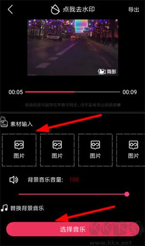2、接下來需要滑動(dòng)到下方使用“素材輸入”功能,添加手機(jī)本地相冊(cè)的圖片素材,甚至是替換背景音樂。