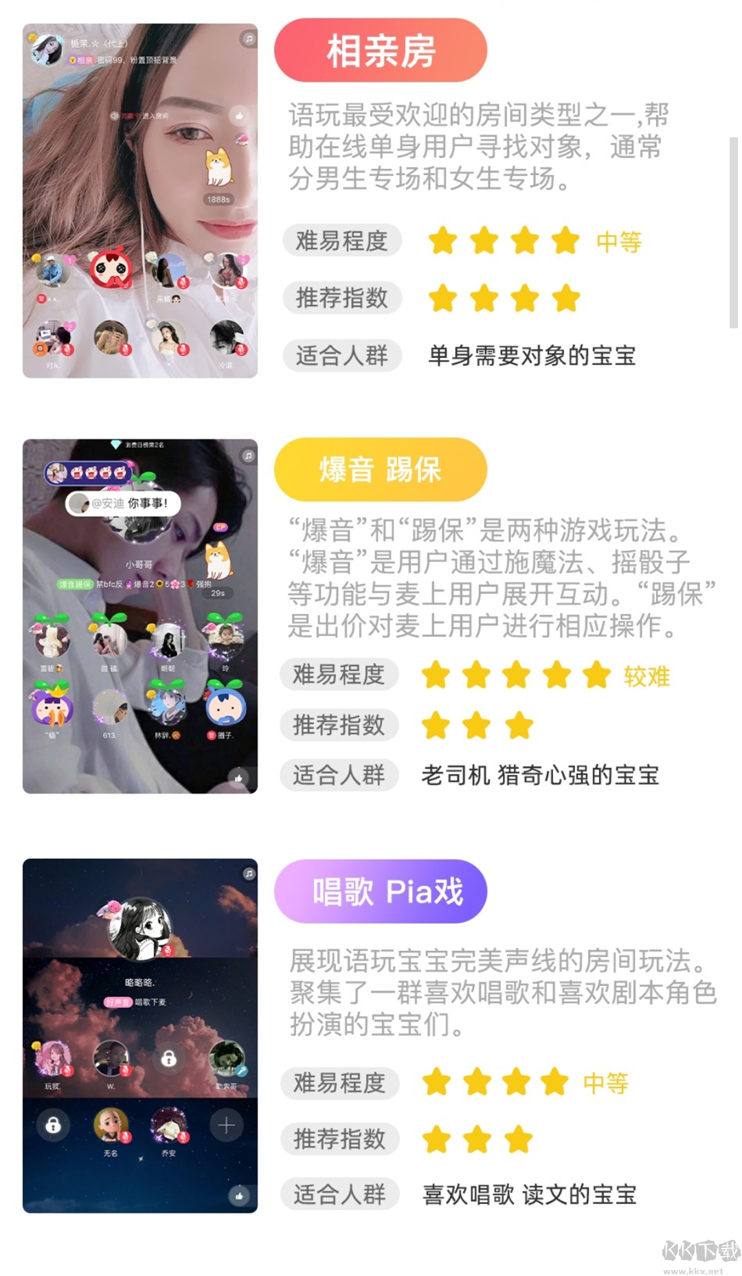 語玩app是一款語音社交的聊天軟件,支持多人搶麥唱歌,通過語音聊天拉近彼此距離,還有趣味游戲互動更盡興。無論是找知己、尋陪伴,都能輕松滿足社交需求,為你的閑暇時光增添樂趣。軟件能遇到比鄰居更暖心的陌生人,還有不少90后、00后的熱心知心小姐姐和暖男小哥哥,和你一起互動玩耍。非常的好玩,喜歡的朋友快來下載試試吧!
