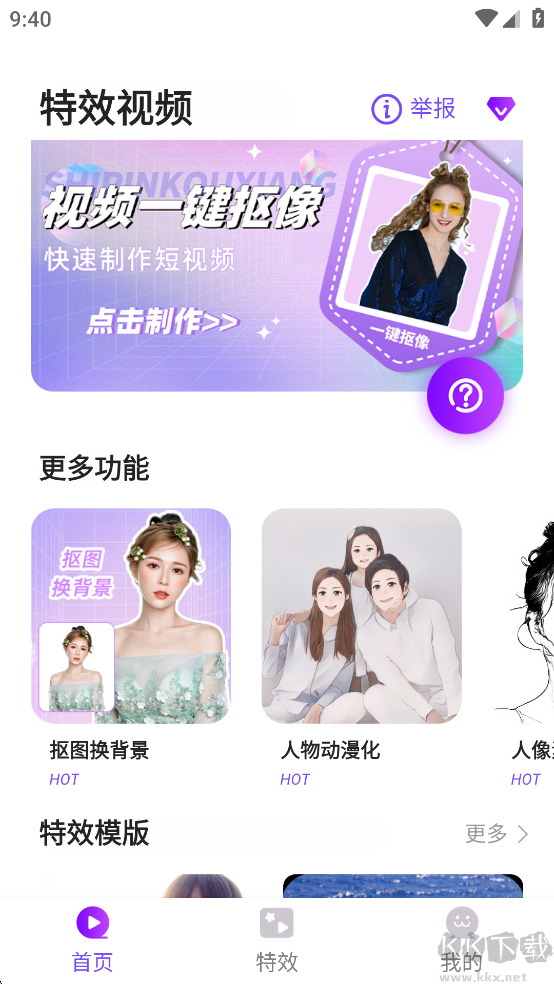 特效視頻app是一款視頻剪輯制作的視頻編輯軟件,功能豐富,包含摳圖換背景、人物動漫化、海量特效模板等,滿足大部分用戶的剪輯需求。它操作簡單,沒有經(jīng)驗(yàn)的用戶也能輕松上手剪輯,制作出屬于自己的創(chuàng)意大片。軟件還擁有豐富的視頻模板,即使沒有好創(chuàng)意,也能輕松做出精彩短視頻;支持將視頻一鍵分享到朋友圈、抖音、西瓜視頻等平臺,還可以一鍵轉(zhuǎn)為GIF動態(tài)圖。喜歡的朋友快來下載試試吧!