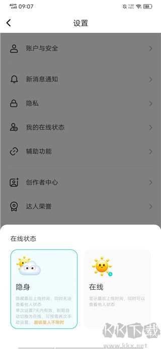 4、在下方彈出的頁面中選擇【隱身】即可完成設置。