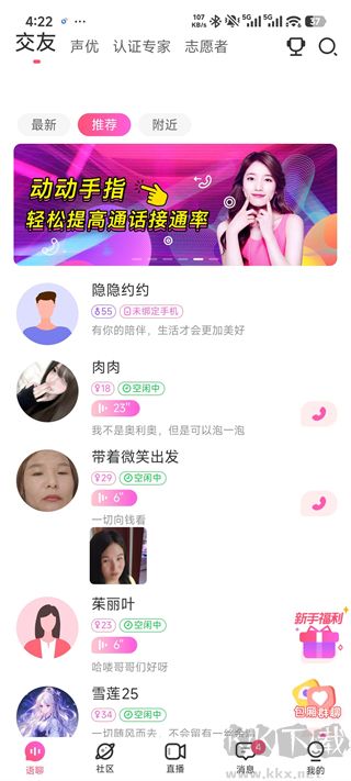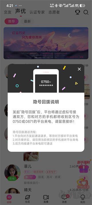 3、首頁推薦熱門直播,可以進(jìn)入直播間觀看主播的語音直播。