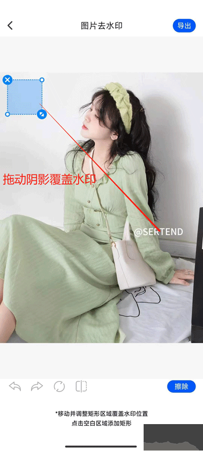 1、圖片去水印,只需將圖片導入應用,框選需去除的水印區(qū)域,點擊完成即可清除水印。