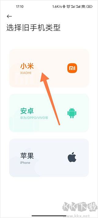 3、舊手機類型中選擇【小米】,根據(jù)舊手機的手機類型選擇;