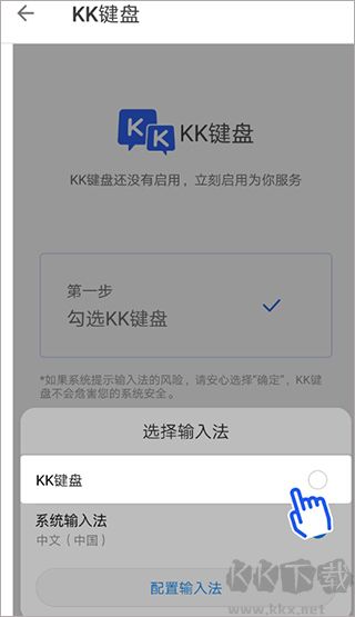 1、在手機(jī)上運(yùn)行軟件,選擇首頁(yè)里的“勾選KK鍵盤(pán)”按鈕,去打開(kāi)設(shè)置功能里啟用KK鍵盤(pán);