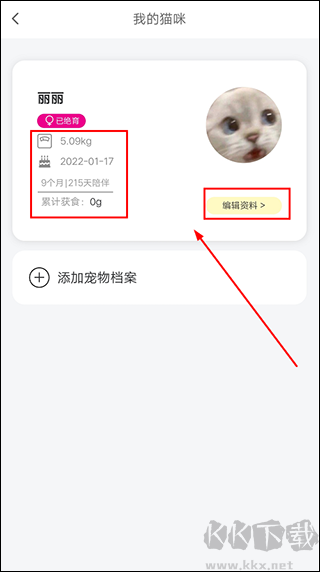 5、填寫完成,即在軟件內(nèi)創(chuàng)建好了貓咪檔案,之后用戶可在這里記錄貓主子的日常之類的信息。