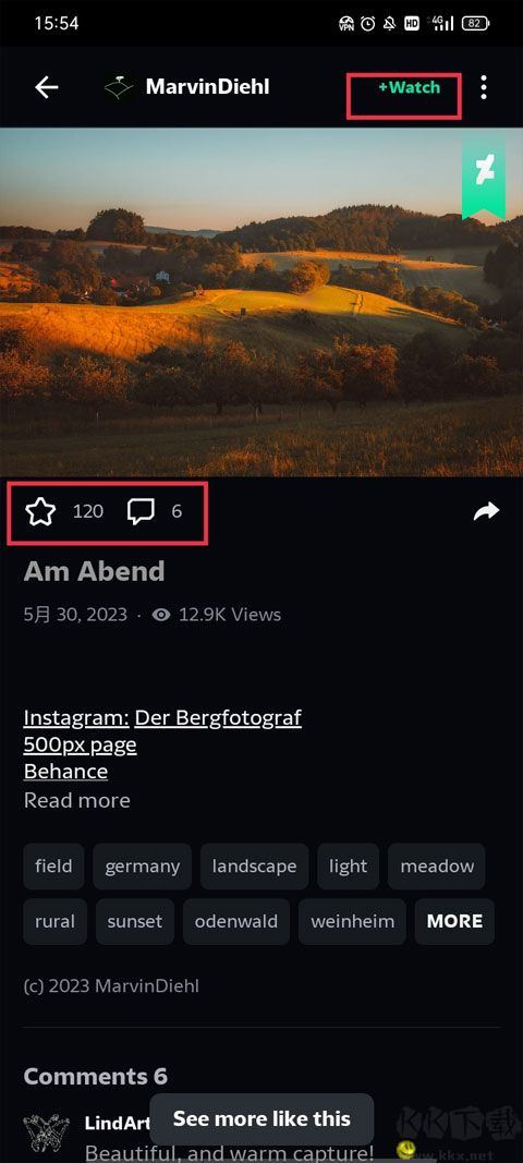 3、當(dāng)你登錄成功后就可以收藏并評論自己喜歡的繪畫、素描等照片,你還可以點(diǎn)擊右上角的“+Watch”進(jìn)行分類,更好地管理圖片。