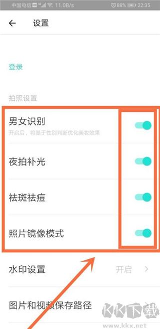 5、在設(shè)置界面依次啟動(dòng)性別識(shí)別、夜間補(bǔ)光、瑕疵修整及影像鏡像功能。