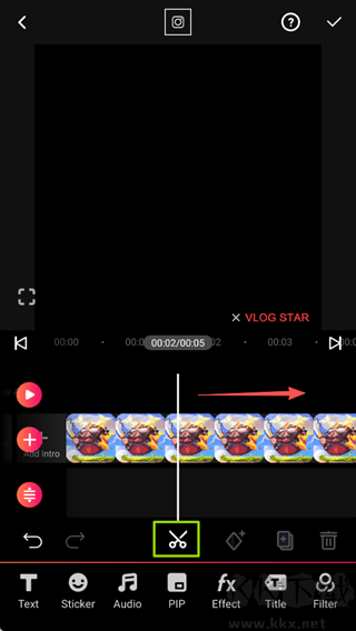 3、滑動(dòng)素材點(diǎn)擊【剪刀】圖標(biāo)可以進(jìn)行剪切,去掉多余的內(nèi)容。