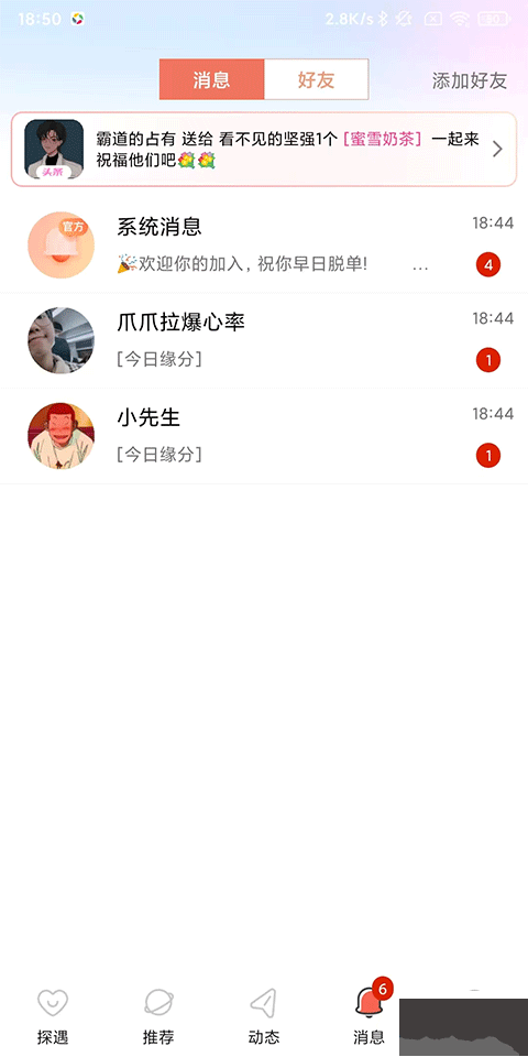 在探遇,男生常會收到女生率先發(fā)送的消息,請注意言辭禮貌、態(tài)度得體,也可在設(shè)置里調(diào)整為免打擾狀態(tài)!