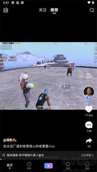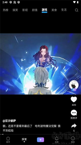 2、探索頁面中有各類短視頻,包括搞笑、影視、游戲、美食等。