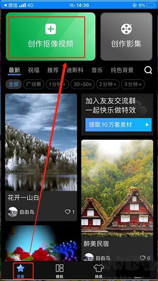 2、進(jìn)入背景界面,點(diǎn)擊創(chuàng)作摳像視頻。