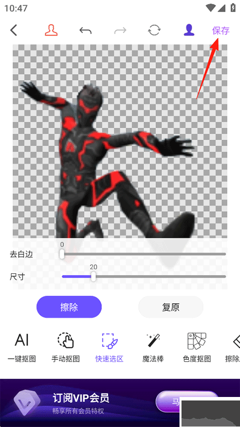 3、自動(dòng)摳圖完成后,可利用輔助工具進(jìn)一步優(yōu)化畫(huà)面,調(diào)整完畢點(diǎn)擊存儲(chǔ)。