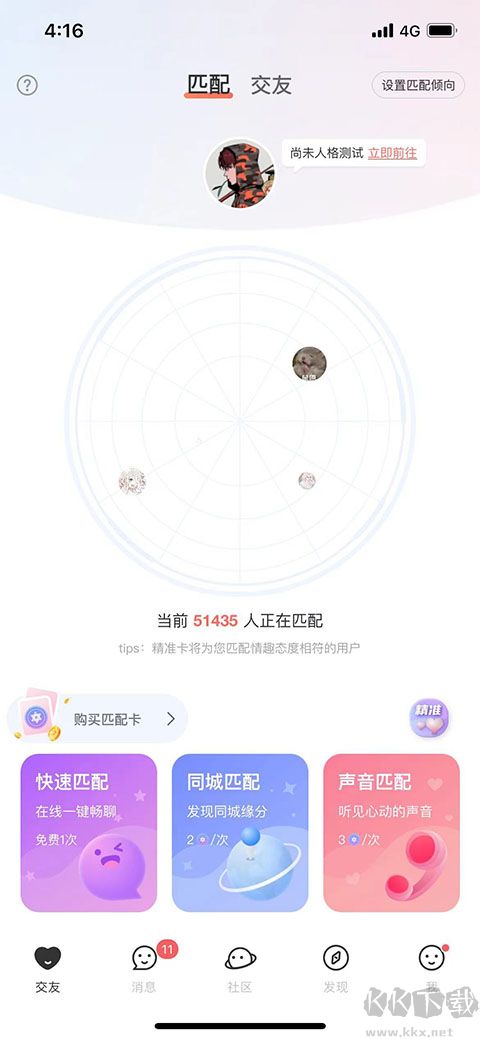 2、點擊交友,用戶可以快速匹配,同城匹配,聲音匹配好友,還可以在線查看推薦好友。
