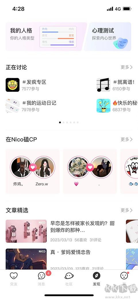 4、在發(fā)現(xiàn)欄目中用戶查看自己的人格類型也可以進行心理測試,同時用戶可以加入當前熱門討論專區(qū)進行討論,還有多種文章精選讓用戶查看。