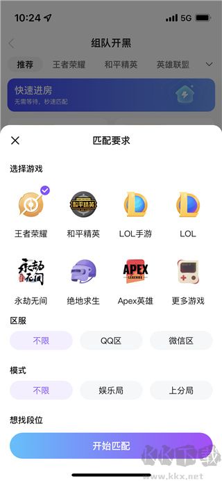 4、通過(guò)“快速進(jìn)房”功能,選擇游戲、區(qū)服、模式、段位,即可無(wú)需等待,秒速匹配。