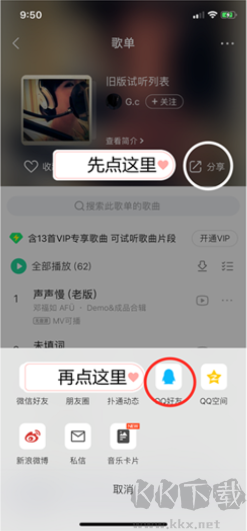 1、首先打開QQ音樂,進(jìn)入自己的歌單頁面,先點(diǎn)擊“分享”,再發(fā)送給自己(或者別人都可以,只要需要歌單鏈接),然后在打開分享的鏈接