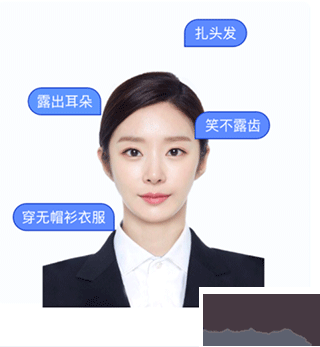 穿著整齊的衣服,避免穿帽衫、戴圍巾和帽子等,盡量扎頭發(fā),露出耳朵,避免披發(fā),建議化淡妝,保持微笑,避免露出牙齒。