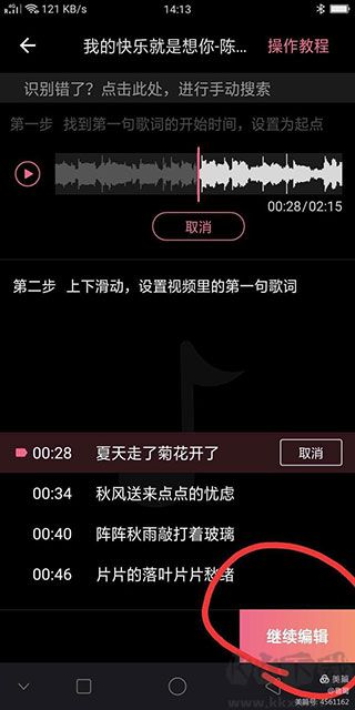 2、然后上下滑動來設(shè)置視頻里出行的第一句歌詞,點擊繼續(xù)編輯;