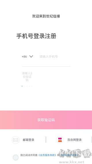 2、進入app后,填寫你的手機號進行注冊等信息,也可以用郵箱、百合網賬號登錄,登錄前需要勾選下方“我已閱讀并同意”協(xié)議。