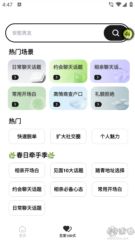 3、戀愛搜搜看:告別“多喝熱水”式回應(yīng),輸入關(guān)鍵詞一鍵搜索,即刻獲取高情商、貼心又得體的最佳回復(fù)。