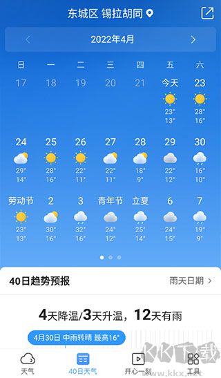 3、在40日天氣頁面,可以查看未來40日的天氣預報,還會自動統(tǒng)計升降溫天數和下雨天數,讓你一目了然。