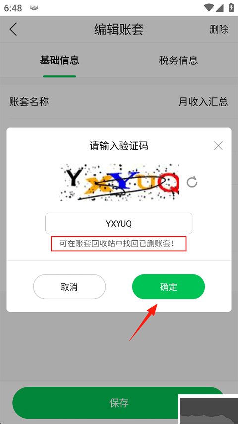 5、輸入下方驗(yàn)證碼,點(diǎn)擊確定完成刪除,刪除的帳套可在回收站中進(jìn)行找回。