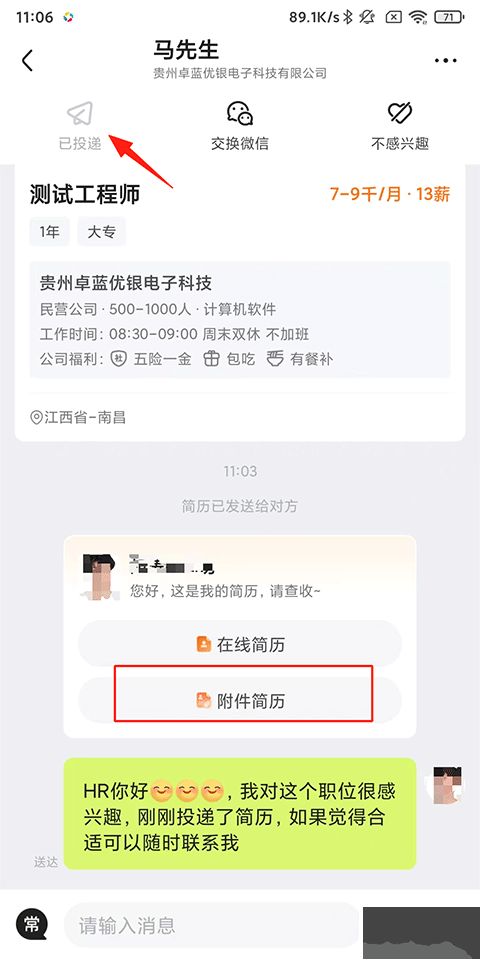 4、上傳后進(jìn)入與HR溝通頁(yè)面,點(diǎn)擊上方的投遞即可發(fā)送簡(jiǎn)歷附件。