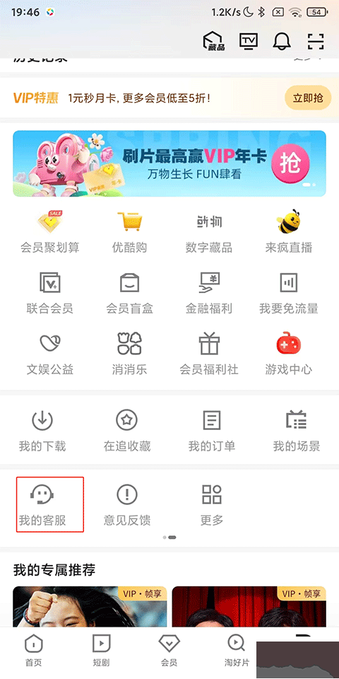 1、打開優(yōu)酷App進入首頁,點擊“我的”-“我的客服”;