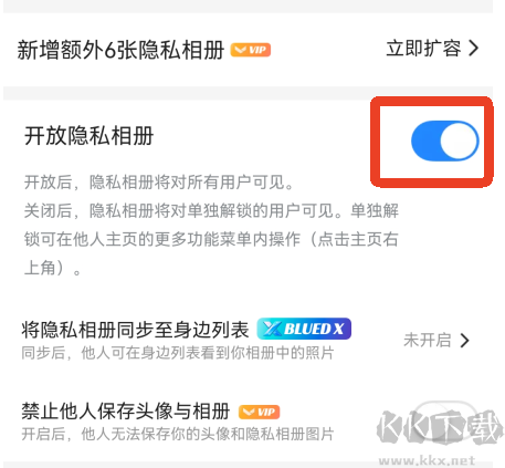 3、點(diǎn)擊【開放隱私相冊(cè)】右邊的滑塊按鈕就能打開了,開啟后隱私相冊(cè)將對(duì)所有用戶可見。