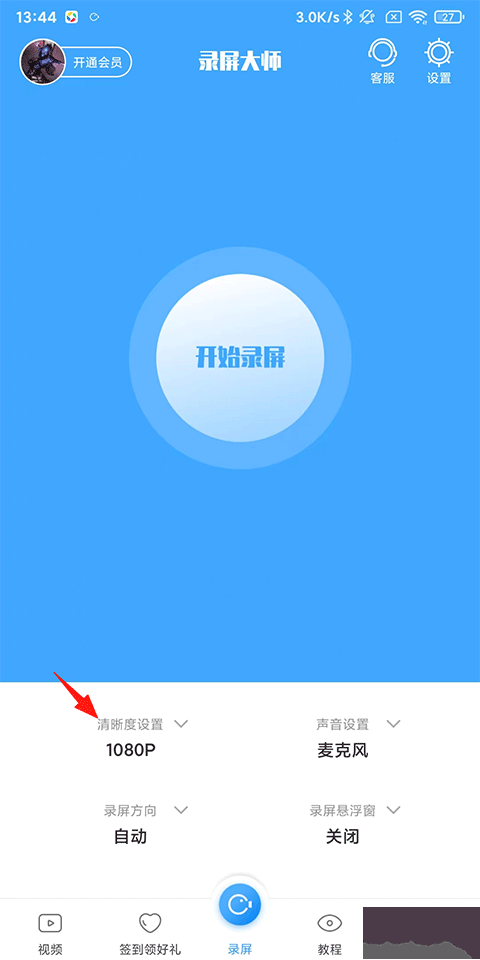 1、打開(kāi)錄屏大師APP,在錄制前點(diǎn)擊下方調(diào)整清晰度、麥克風(fēng)、錄屏方向等設(shè)置,接著點(diǎn)擊開(kāi)始錄屏;