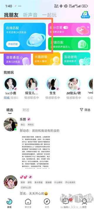 赫茲app是一款優(yōu)質(zhì)交友軟件,內(nèi)置海量優(yōu)質(zhì)KTV、背景、歌曲,還有真心話大冒險等娛樂環(huán)節(jié)。支持播放背景音樂,可以一鍵活躍氣氛,炫酷的背景桌面還能提升異性好感度。軟件可以發(fā)聲交流,找人聊天、開黑、談心,多樣玩法可隨心選擇。提供一鍵快速匹配,讓你可以找到心儀的伙伴,告別孤單,需要的朋友快來下載試試吧!